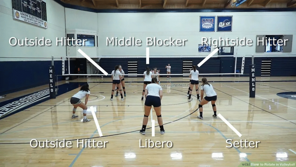 Players rotate clockwise after winning a rally when the other team served. This ensures everyone plays in both front and back court positions. Positions are numbered 1 to 6, with specialized roles like: